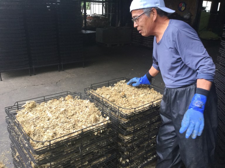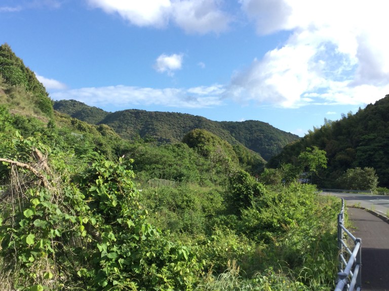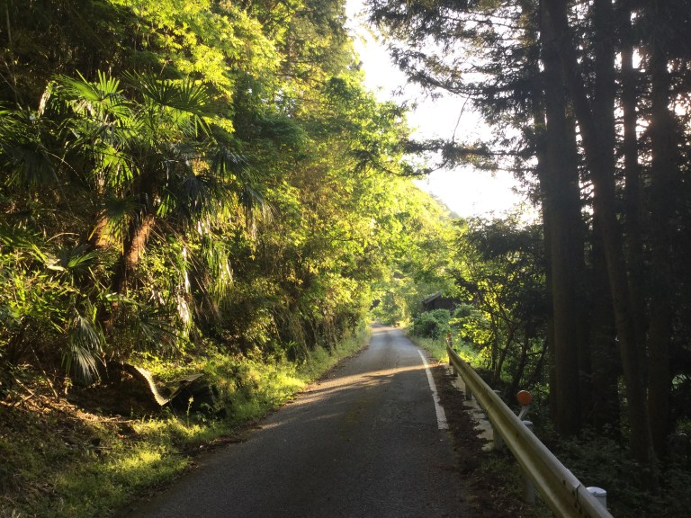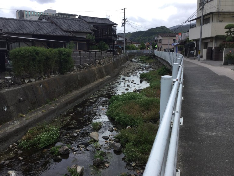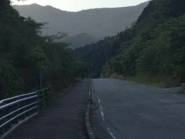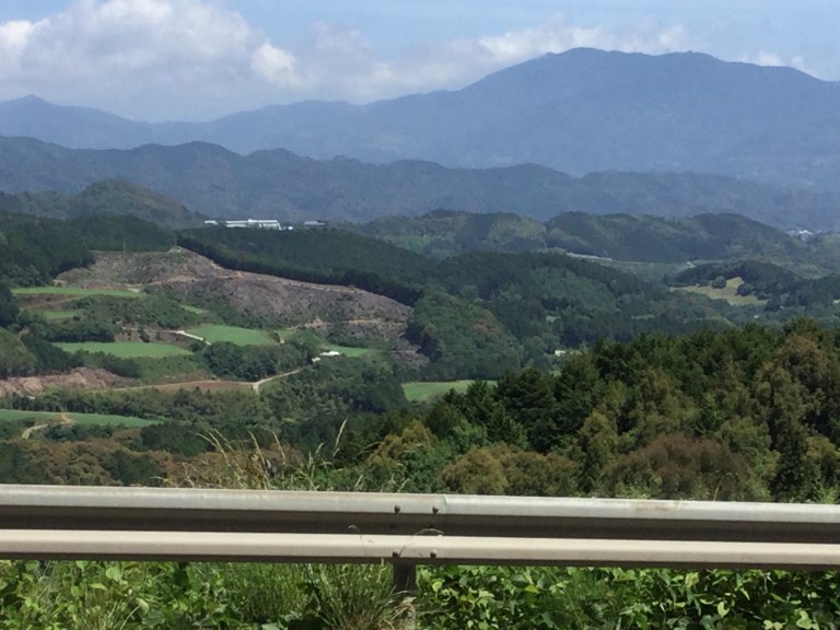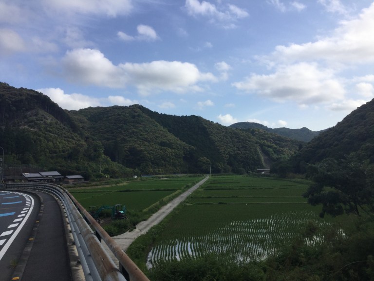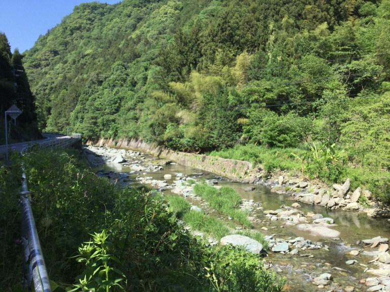 Le soleil nous accompagne sans la circulation. Ce seront 20 kilomètres d’une douce et lente montée sans surprise pendant les 3/4 de la journée. Nous remontons un torrent de montagne et constatons que la sécheresse sévit au Japon et affecte la culture des rizières.
