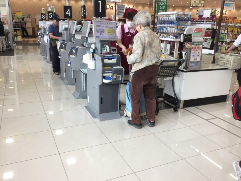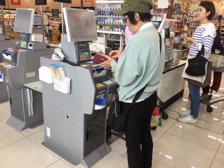 Le passage en caisse est le suivant: vous posez votre ou vos paniers (pas de caddie vus au Japon dans mon humble expérience), la caissière prend chaque article, le scanne en disant ce que c’est et le repose dans un autre panier. Les caissières sont hyper rapides aussi bien dans leurs gestes que dans leur débit verbal. Pour le paiement. Comme le montant est affiché, vous introduisez billets et monnaie et la machine enregistre, et au cas où, vous rend la différence.