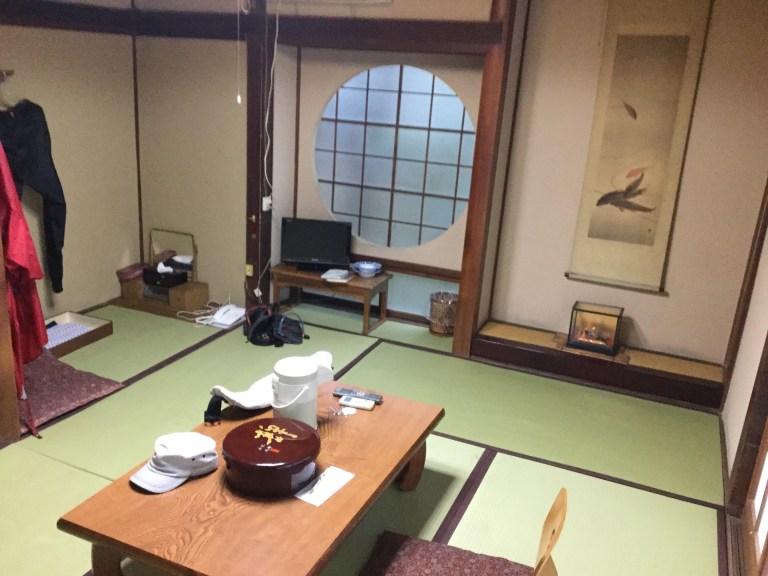 L’avantage avec les Minshuku, c’est d’avoir un bain, une laverie à disposition, et de pouvoir manger en kimono dans sa chambre si on le désire. Certes on marche sur des tatamis, on dort sur un futon, les toilettes sont communes, les parois minces et coulissantes, qu’importe, c’est le Japon.